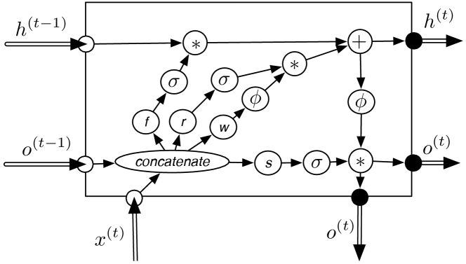 Each of , , , and is a dense linear function with parameters shared across time. is sigmoid, is . Each arithmetic function acts point-wise.